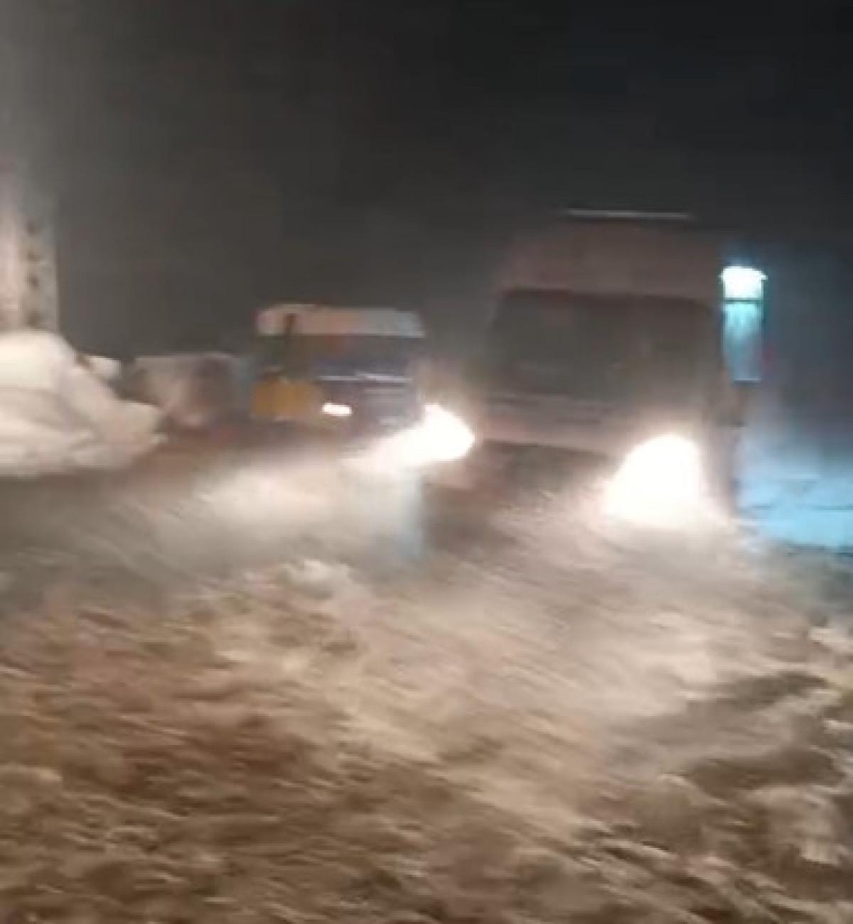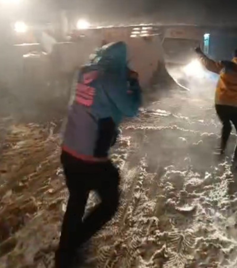 İlçe Özel İdaresi VEDAŞ ekiplerini kurtarmak için bölgeye geldi ve içeresinde acil hasta olan minibüsle ekiplerin mahsur kaldığını gördü.