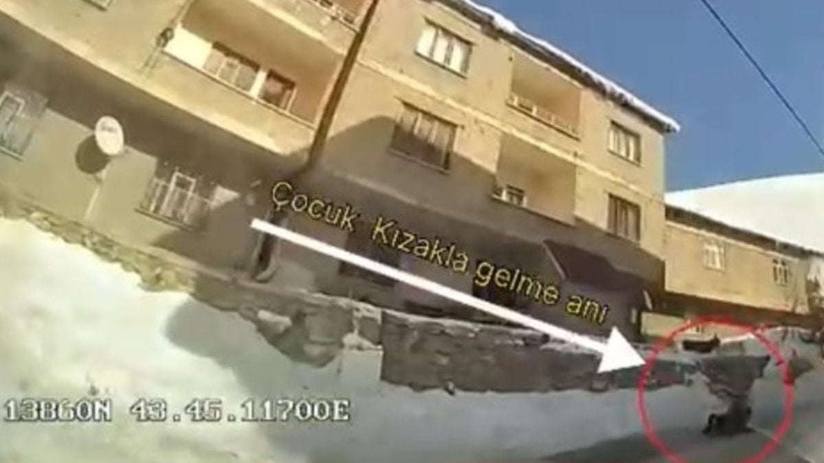 Görüntülerde çocuğun kızakla yolda kaydığı sırada otobüsün çarptığı anlar yer aldı.