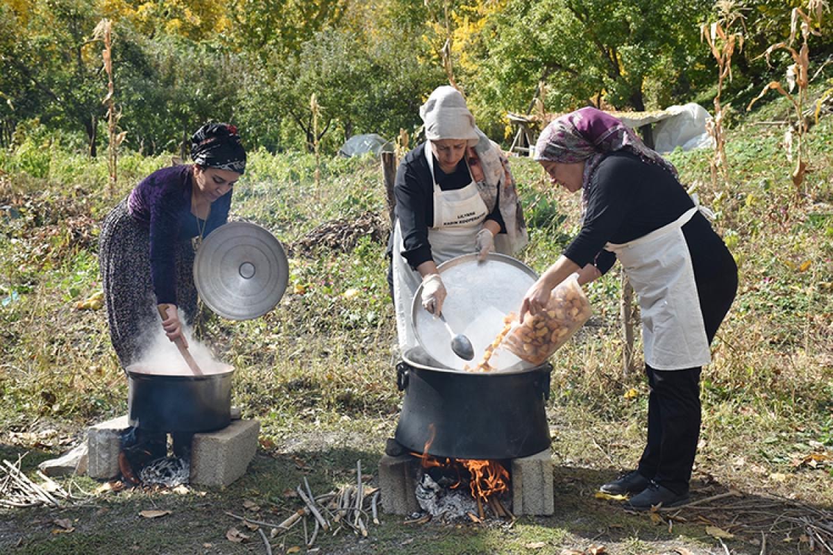 Bu ürünlerin bir kısmıyla turşu, kahvaltılık sos yapan ve kurutan kadınlar, diğer kısmıyla da Merzan Mahallesi'nde odun ateşine koydukları kazanlarda pişirerek reçel ve marmelat hazırlıyor.