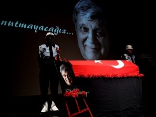 Akçatepe'nin Türk Bayrağı'na sarılı tabutu son kez sahneye çıkarıldı, "Unutmayacağız." yazısıyla bir fotoğrafı perdeye yansıtıldı.
