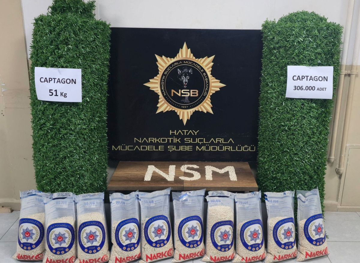 Yapılan çalışmalar kapsamında Antakya Derince Mahallesi'nde bulunan bir iş yerinde yapılan aramada bahçe çiti yapımında kullanılan suni çimler arasında gizlenmiş halde; 51 Kilogram ağırlığında 306 bin adet captagon hap ele geçirildi.