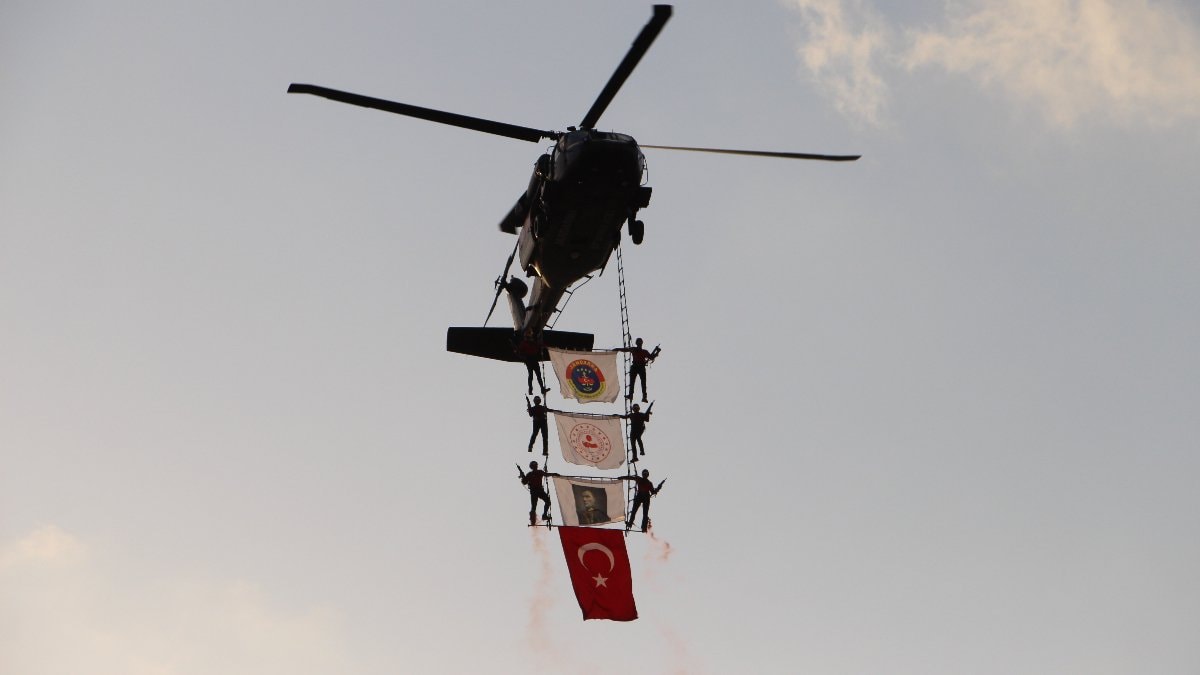 Skorsky helikopterin alan üzerindeki uçuşu ve jandarma personelinin gösterisi ilgiyle izlendi.