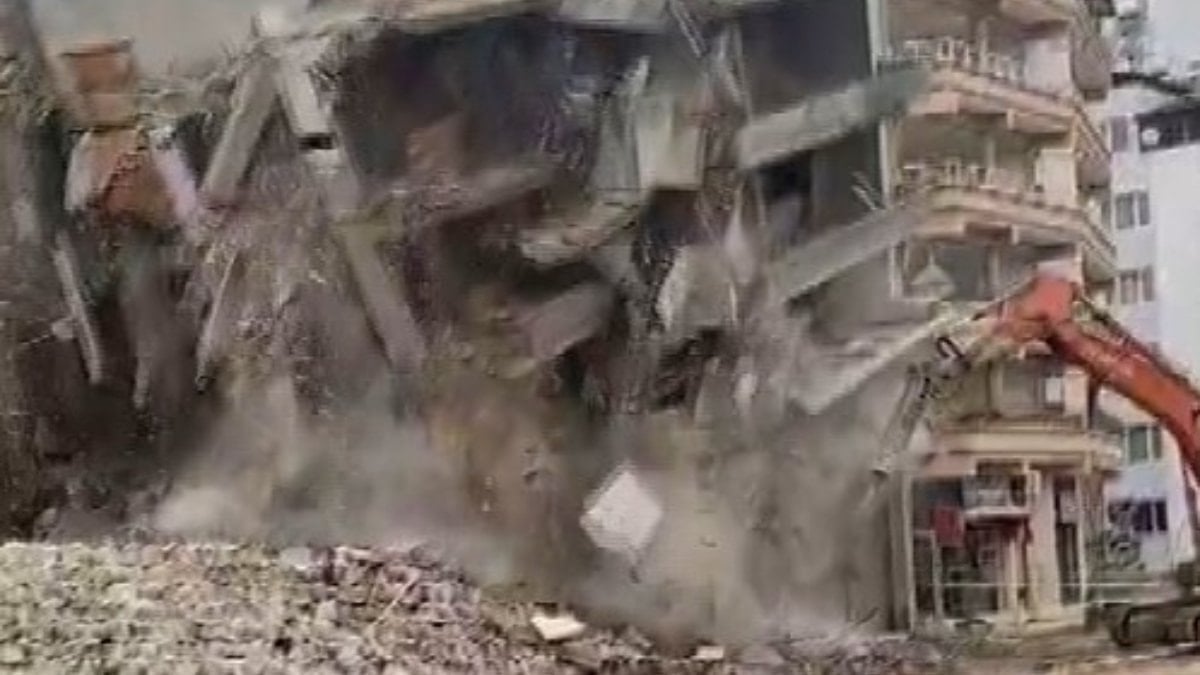 - Defne ilçesinde ağır hasarlı 5 katlı bir bina iş makinesiyle yıkıldı.