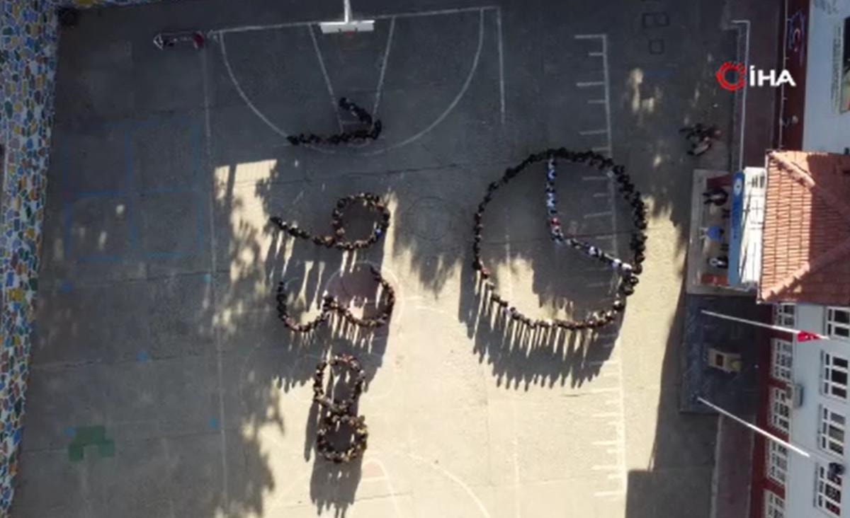 Belen 70.Yıl İskan İlkokulu öğrencileri, bedenleriyle 1938 ve saat 9’u 5 geçe koreografisi oluşturdu.
