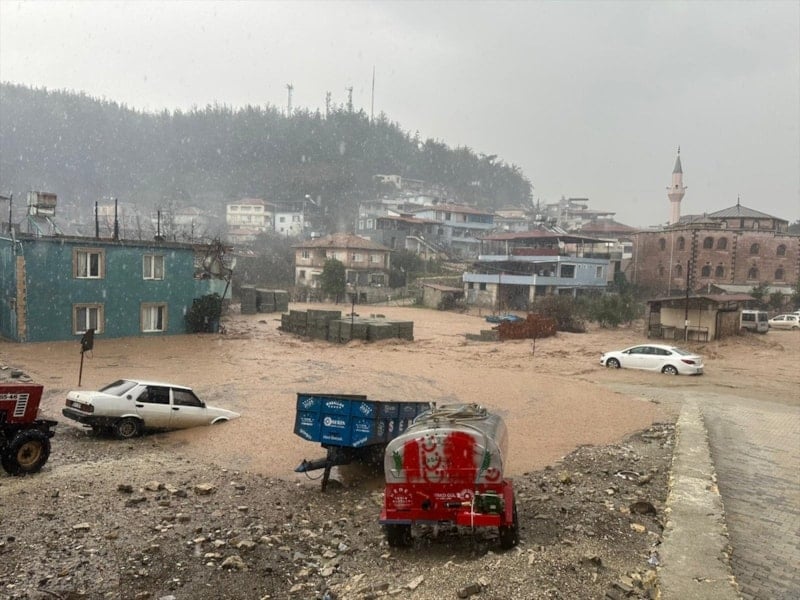 Yayladağı ilçesinde sağanak nedeniyle ev ve iş yerlerini su bastı, caddelerde su birikintileri oluştu, bazı araçlar yolda mahsur kaldı.
