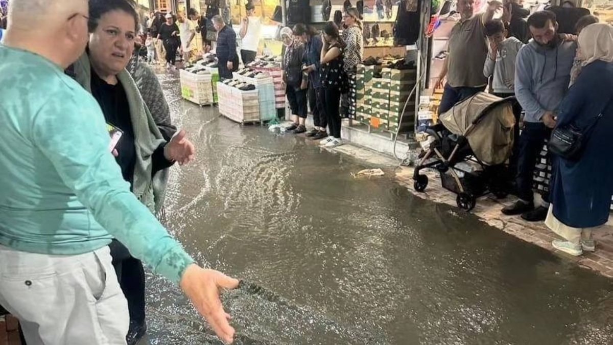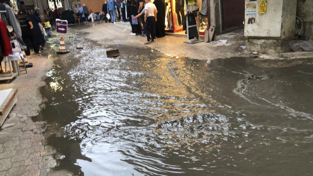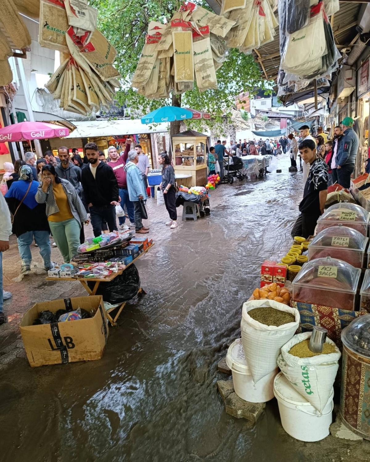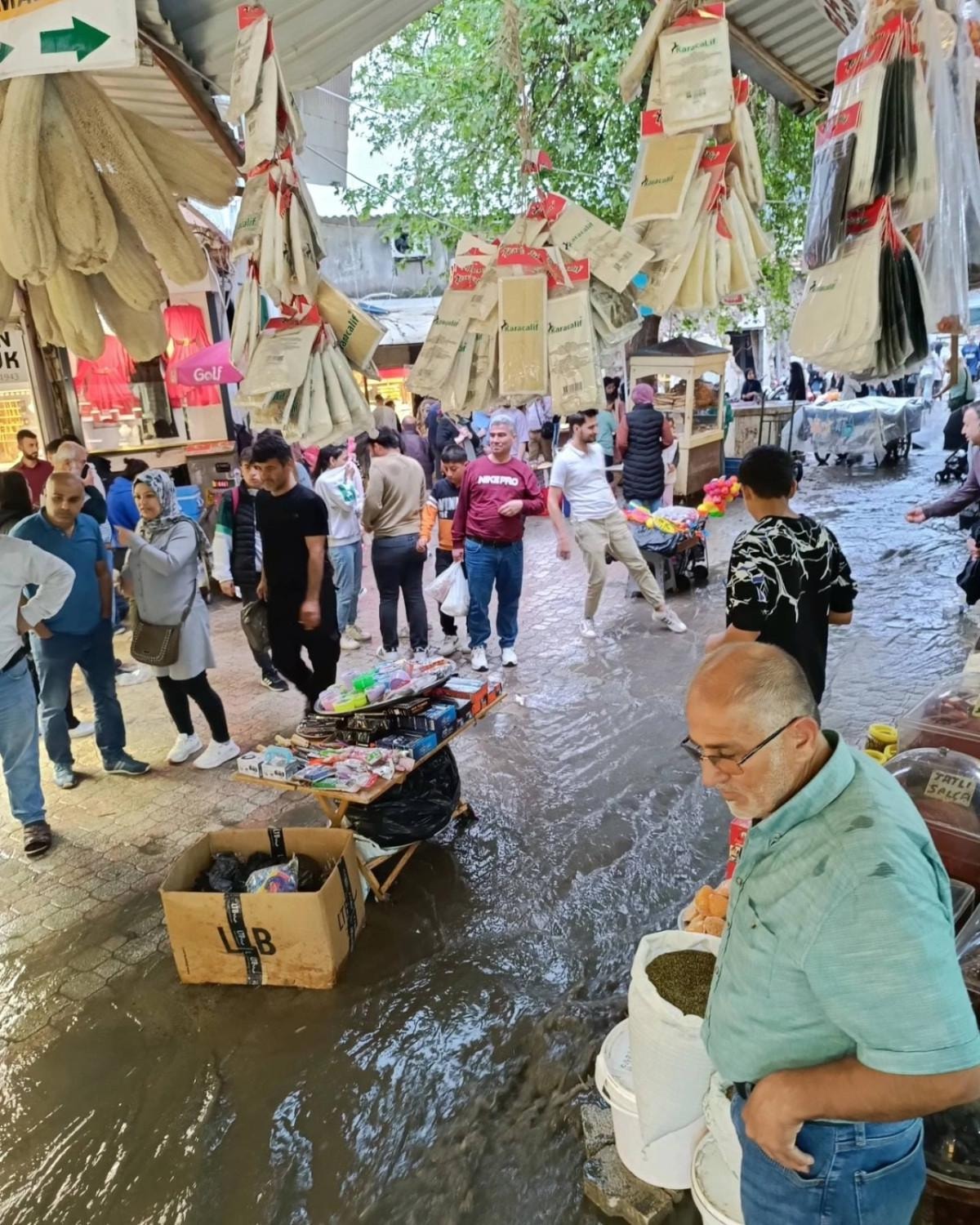 Bayram alışverişi için çarşıda yoğunluk oluşturanlar, zor anlar yaşadı. Bölgede yollar göle dönerken, çarşıdaki bazı iş yerlerini su bastı.