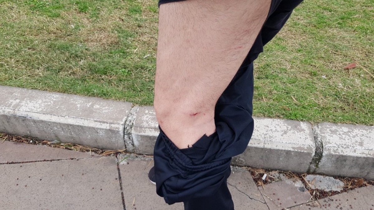 Sol bacağından yaralanan ve eşofmanı da parçalanan Özdemir, çevredekilerin müdahalesiyle köpeklerden kurtuldu.