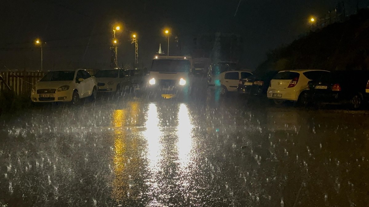 Yağışlı havayla birlikte yollar göle dönerken, şimşekler geceyi aydınlattı.