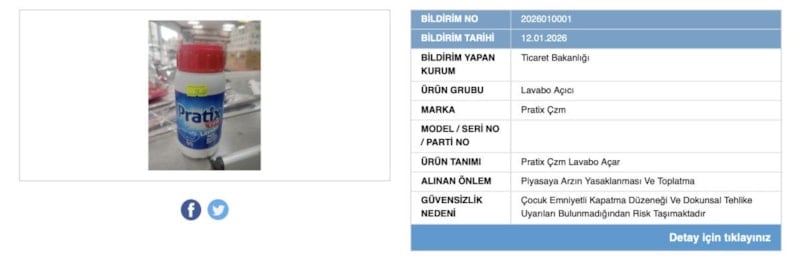 Bakanlık, Pratix Çzm marka lavabo açıcının çocuk emniyet kapatma düzeneği olmaması sebebiyle satışını durdudu.