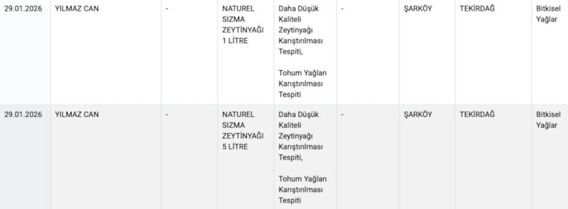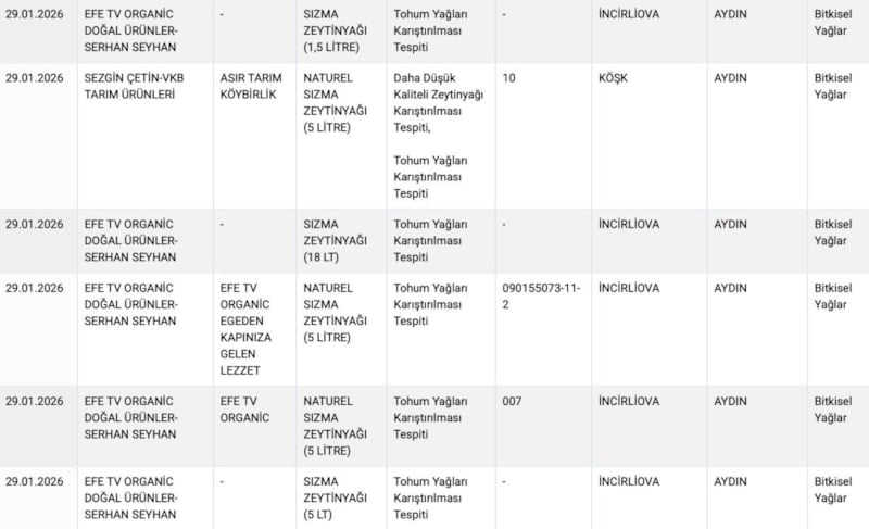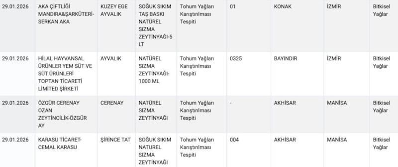 "guvenilirgida.tarimorman.gov.tr" adresi üzerinden erişime açılan listede, özellikle zeytinyağı kategorisindeki usulsüzlükler dikkat çekti.