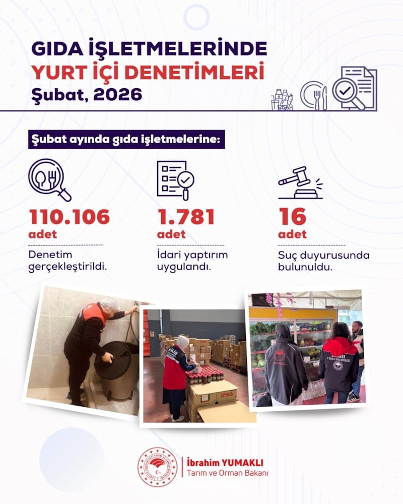 Şubat ayında 110 bin 106 gıda denetimi yapıldığını belirten Tarım ve Orman Bakanı İbrahim Yumaklı, denetimler sonucunda bin 781 işletmeye yaptırım uygulandığını ve 144 milyon 264 bin TL idari para cezası kesildiğini aktardı.