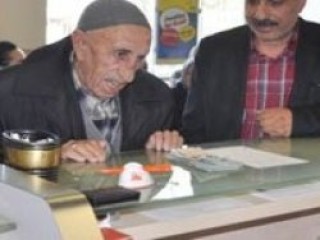 Merkez Osmangazi İlçesi Doğanbey Mahallesi'nde yaşayan ve Türkiye'nin en yaşlı emeklisi olan 6 çocuk ve 60 torun sahibi İbrahim Eren, bugün ilk maaşı olan 1200 TL aldı.