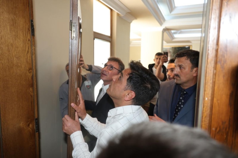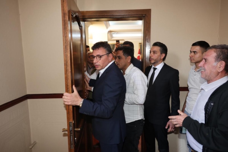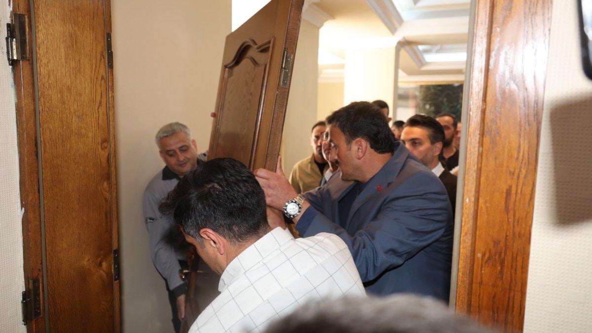 Belediyede gerçekleştirilen devir teslim töreninin ardından Başkan Dönmez'in ilk icraatı makam kapısını sökmek oldu.