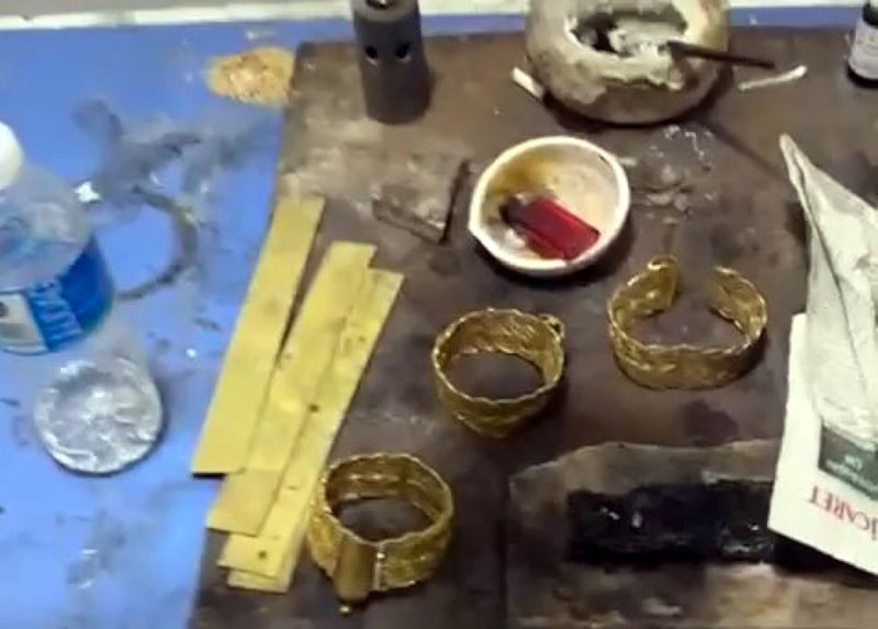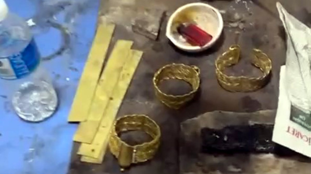 Yapılan aramalarda sahte altın üretiminde kullanılan kimyasal maddeler, çeşitli makine ve düzenekler ile kurumaya bırakılmış 3 altın görünümlü sahte bilezik ele geçirildi.