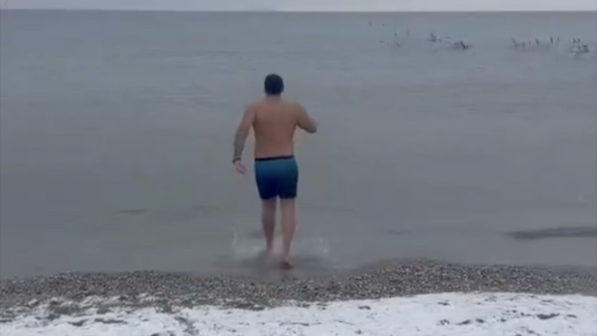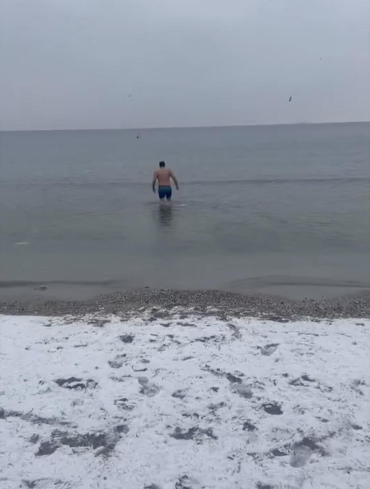 Büyükçekmece'de soğuk havaya aldırış etmeyen bir kişi ise mayosunu giyip karla kaplı sahilde buz gibi denize girdi.