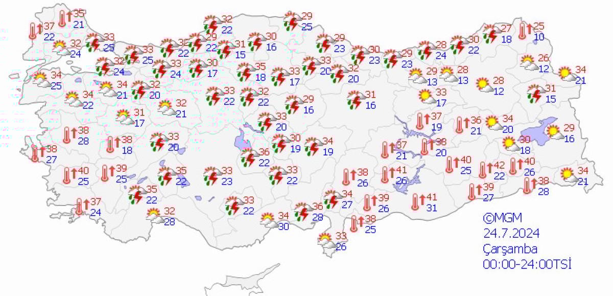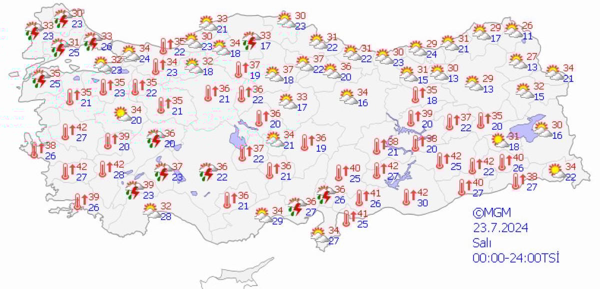 Meteoroloji Genel Müdürlüğü (MGM), 23 Temmuz’a ilişkin hava durumu raporunu yayınladı.