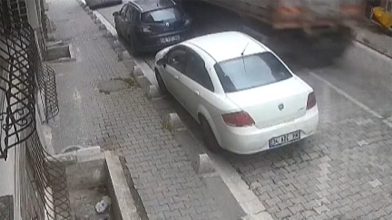 İstanbul Esenyurt'ta park halindeki kamyonun kendine kendine hareket ederek kamyonetin üzerine düştüğü anlar güvenlik kameralarına yansıdı.