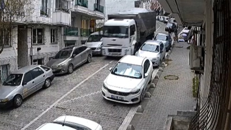 İstanbul'un Esenyurt ilçesi Piri Reis Mahallesi'nde park halindeki kamyon, bir anda kendi kendine hareket ederek ilerlemeye başladı.