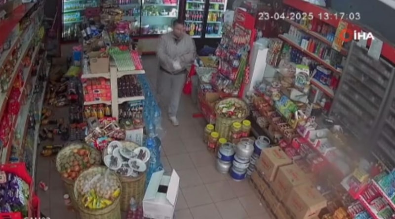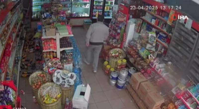 Yaşanan panik anları ve ürünlerin yere düşme anı güvenlik kamerasına yansıdı.