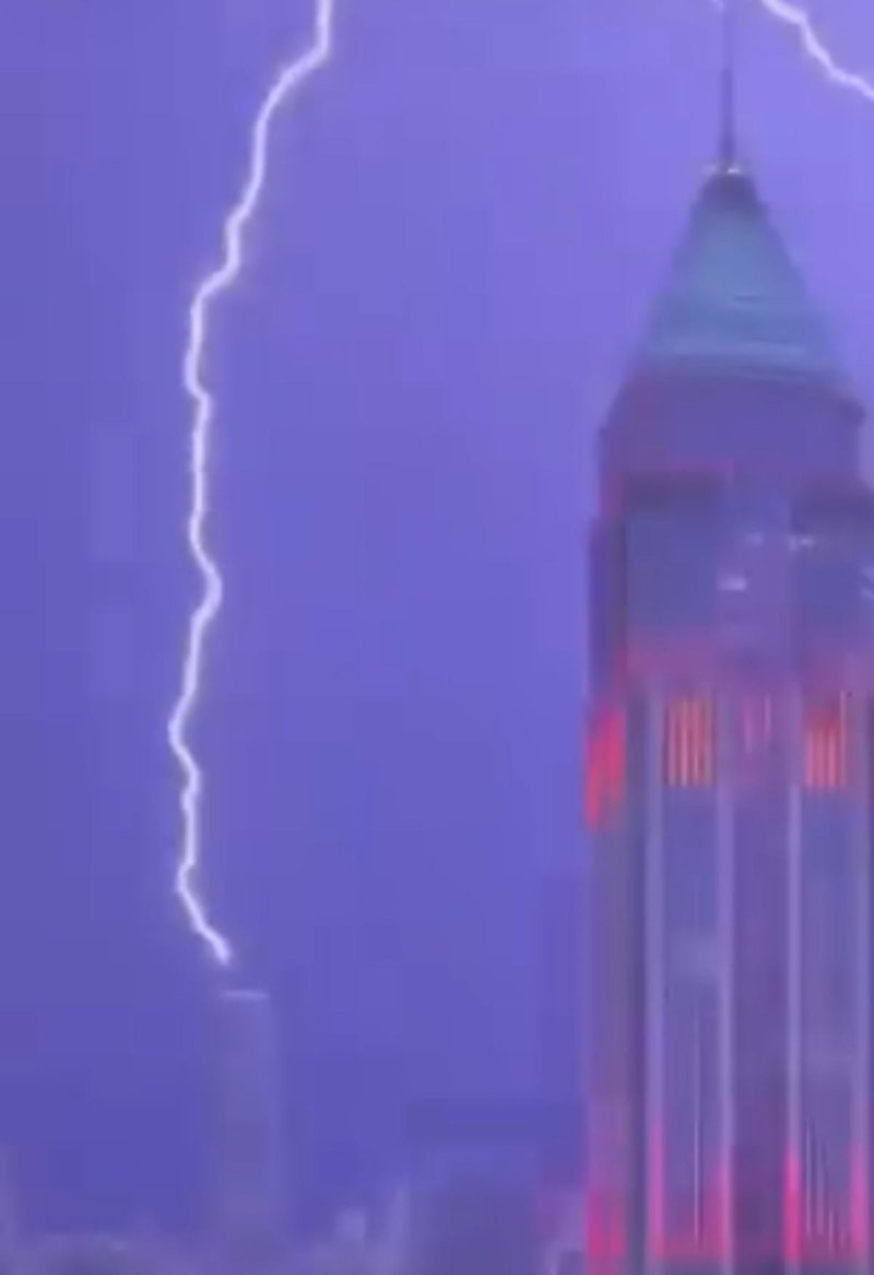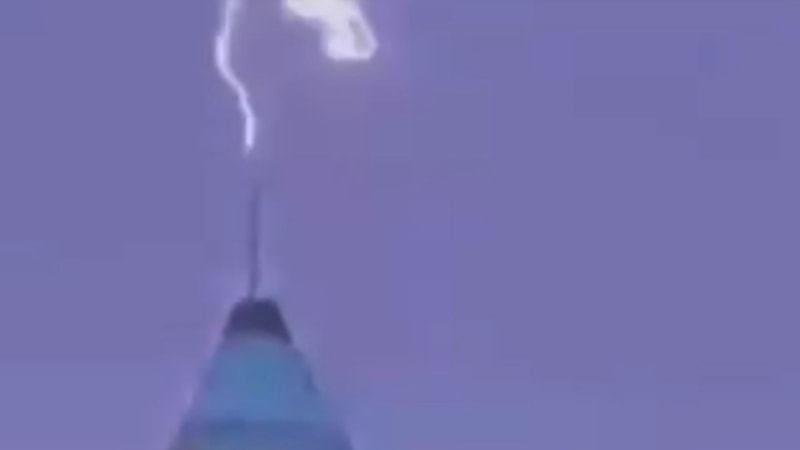 Yıldırımın gökdelenin tepesine düşmesiyle kısa süreli bir parlaklık oluştu.