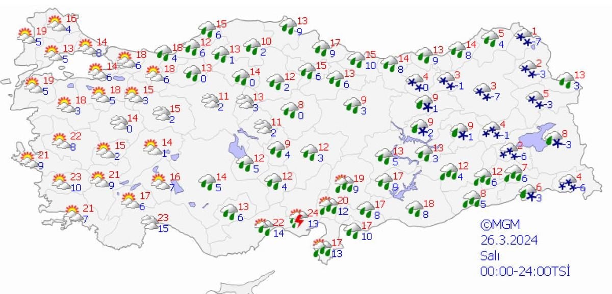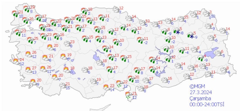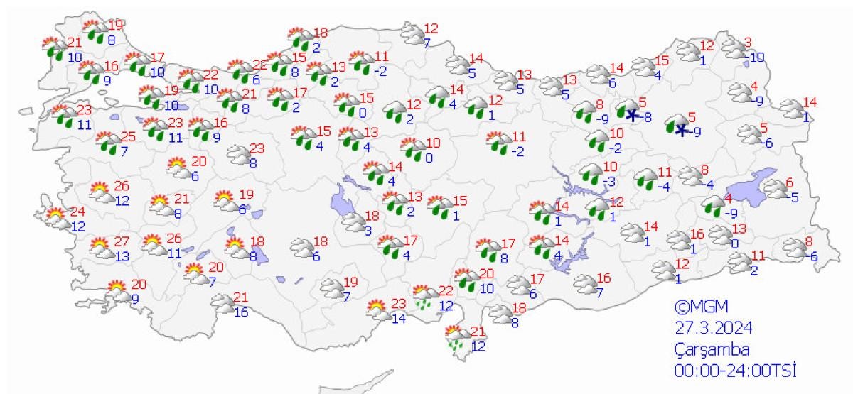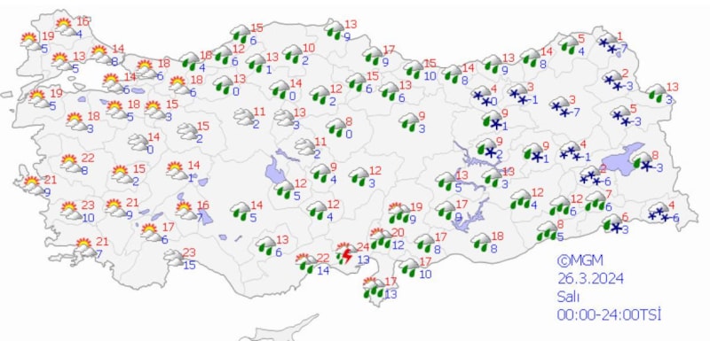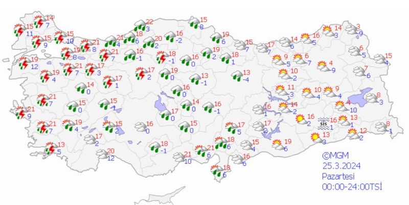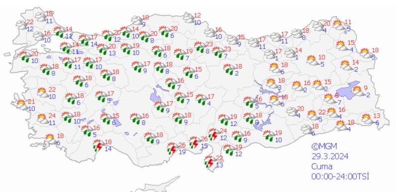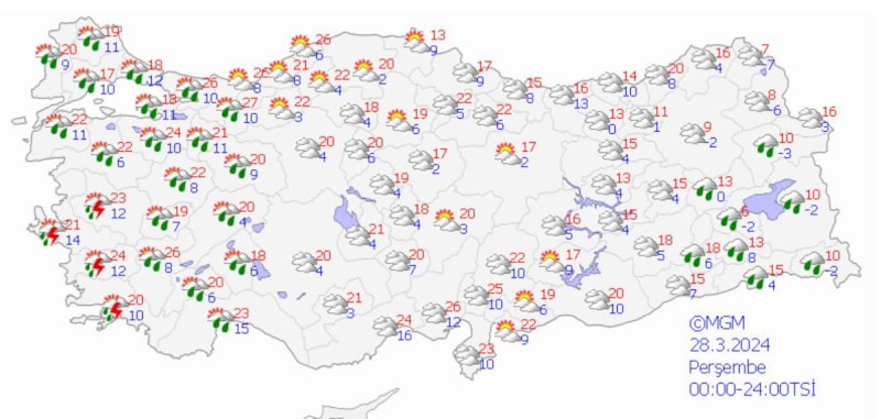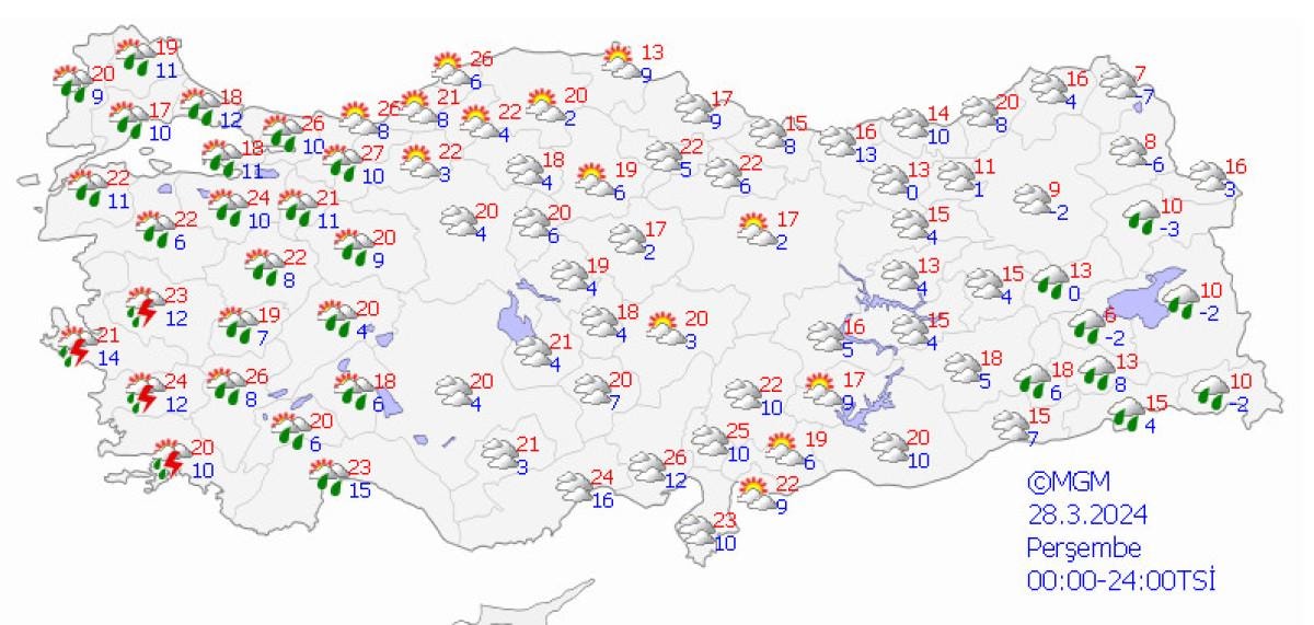 İzmir, Aydın, Manisa, Balıkesir, Bursa, Bilecik, Sakarya, Çanakkale'nin güneyi, Muğla'nın iç kesimleri, Bolu, Düzce, Zonguldak, Bartın ve Karabük cevrelerinde kuvvetli beklenen sağanak ve gök gürültülü sağanak yağışların yerel kuvvetli (21-50 kg/m2) olacağı tahmin ediliyor.