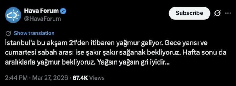 “İstanbul'a bu akşam 21'den itibaren yağmur geliyor. Gece yarısı ve cumartesi sabah arası ise şakır şakır sağanak bekliyoruz. Hafta sonu da aralıklarla yağmur bekliyoruz. Yağsın yağsın gri iyidir…”