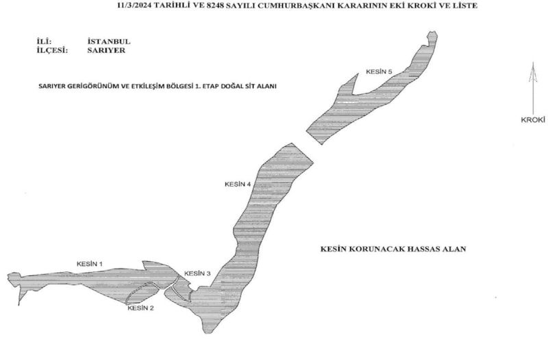 Sarıyer Gerigörünüm ve Etkileşim Bölgesi 1. Etap Doğal Sit Alanı'nın krokisi, sınır ve koordinatları gösterilen alanlar, kesin korunacak hassas alan olarak tescil ve ilan edildi.