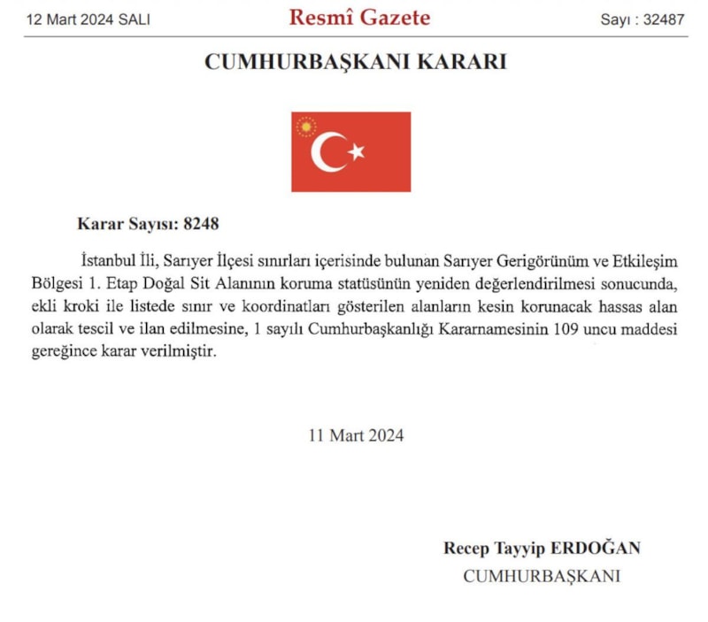 Resmi Gazete'de yayınlanan Cumhurbaşkanı kararı ile birlikte Sarıyer ilçesinde bulunan Sarıyer Gerigörünüm ve Etkileşim Bölgesi 1. Etap Doğal Sit Alanı'nın koruma statüsü yeniden değerlendirildi.