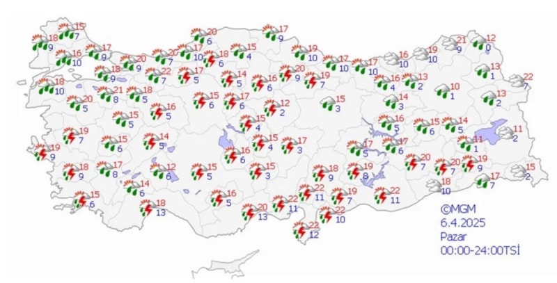 MGM'nin yayınladığı 5 günlük tahmin haritasında göre, 6 Nisan günü ülke genelinde sıcaklıklar 1 ila 22 derece arasında değişiyor. Batı bölgelerde, özellikle Ege ve Marmara’da, sıcaklıklar 15-22 derece civarında seyrederken, iç ve doğu kesimlerde 1-10 derece arasında daha serin bir hava hakim.