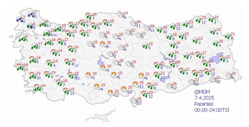 7 Nisan için yayınlanan haritaya göre, Sıcaklıklar 2 ila 26 derece arasında değişecek. Güney ve batı bölgelerde daha ılık bir hava hâkim olacak; Antalya’da 25, İzmir’de 19, Muğla’da 23 derece ölçülecek, ancak iç ve doğu kesimlerde sıcaklıklar daha düşük seyredecek, Erzurum’da 2, Kars’ta 4, Sivas’ta 3 derece civarında olacak.