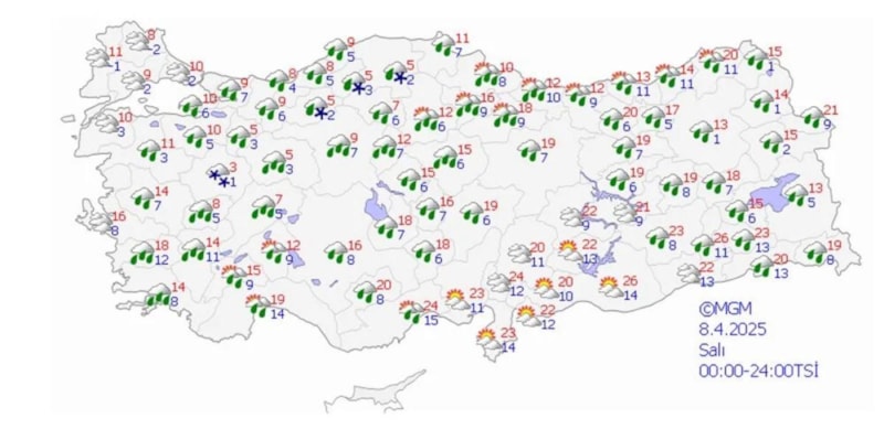 8 Nisan için, sıcaklıklar 1 ila 26 derece arasında değişecek. Güney ve batı bölgelerde hava ılık seyredecek; Antalya’da 24, Muğla’da 23, İzmir’de 15 derece ölçülecek.