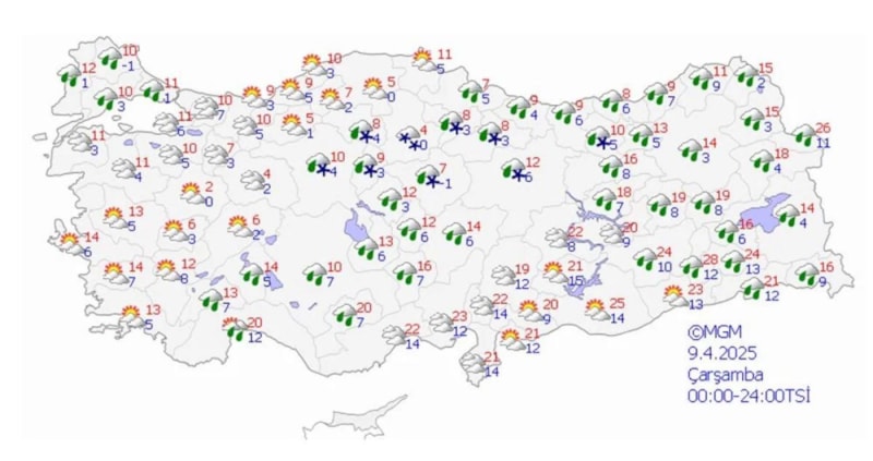 Çarşamba günü, sıcaklıklar -1 ila 28 derece arasında değişecek. Güney ve batı bölgelerde hava ılık olacak; Antalya’da 25, Muğla’da 22, İzmir’de 14 derece ölçülecek.