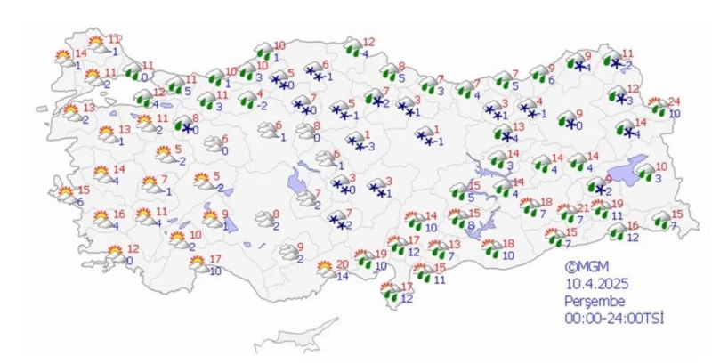 10 Nisan 2025 Perşembe günü Türkiye genelinde sıcaklıklar -3 ila 21 derece arasında değişecek.