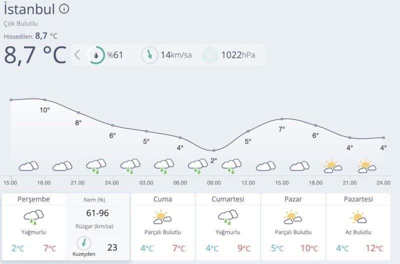 Yarın (26.02.2026) beklenen en yüksek hava sıcaklığının ise 8 derece olacağı tahmin edilmektedir.