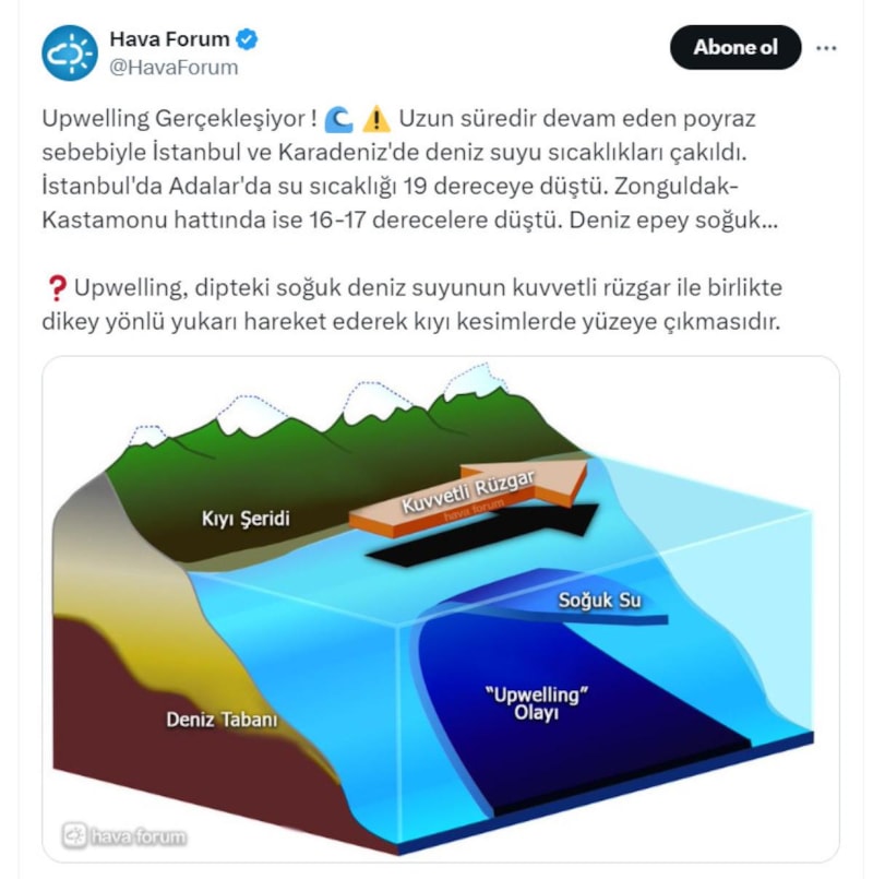 Paylaşımda, "Upwelling Gerçekleşiyor! Uzun süredir devam eden poyraz sebebiyle İstanbul ve Karadeniz'de deniz suyu sıcaklıkları çakıldı. İstanbul'da Adalar'da su sıcaklığı 19 dereceye düştü. Zonguldak-Kastamonu hattında ise 16-17 derecelere düştü. Deniz epey soğuk..." ifadeleri yer aldı.