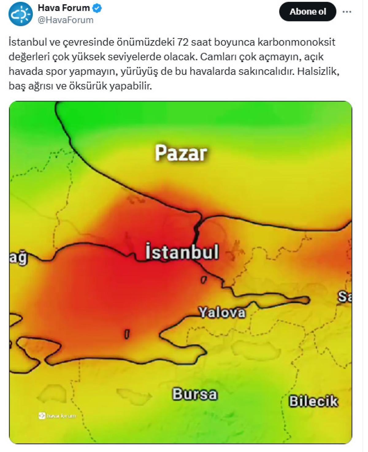 Hava Forum'dan bildirilene göre, İstanbul ve çevresinde önümüzdeki 72 saat boyunca karbonmonoksit değerleri çok yüksek seviyelerde olacak.