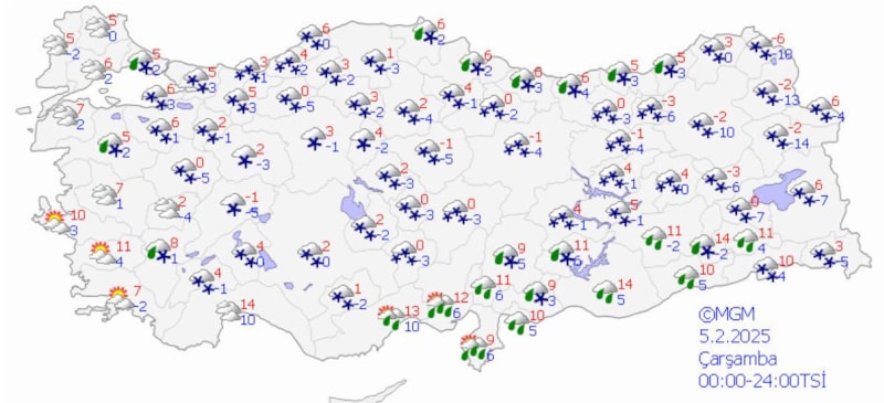 İstanbul'da 5 Şubat Çarşamba günü çok bulutlu, yağmurlu, zamanla karla karışık yağmurlu, kuzey kesimleri ve kentin yüksekleri ise hafif kar yağışlı.