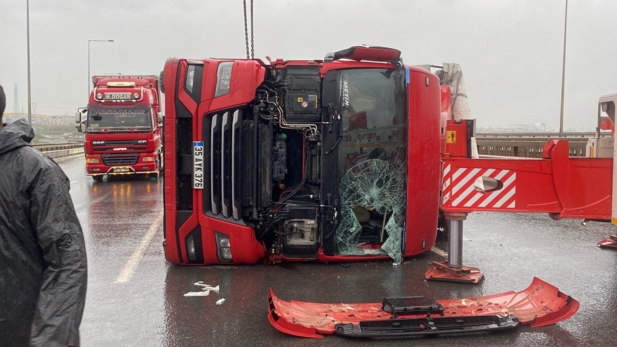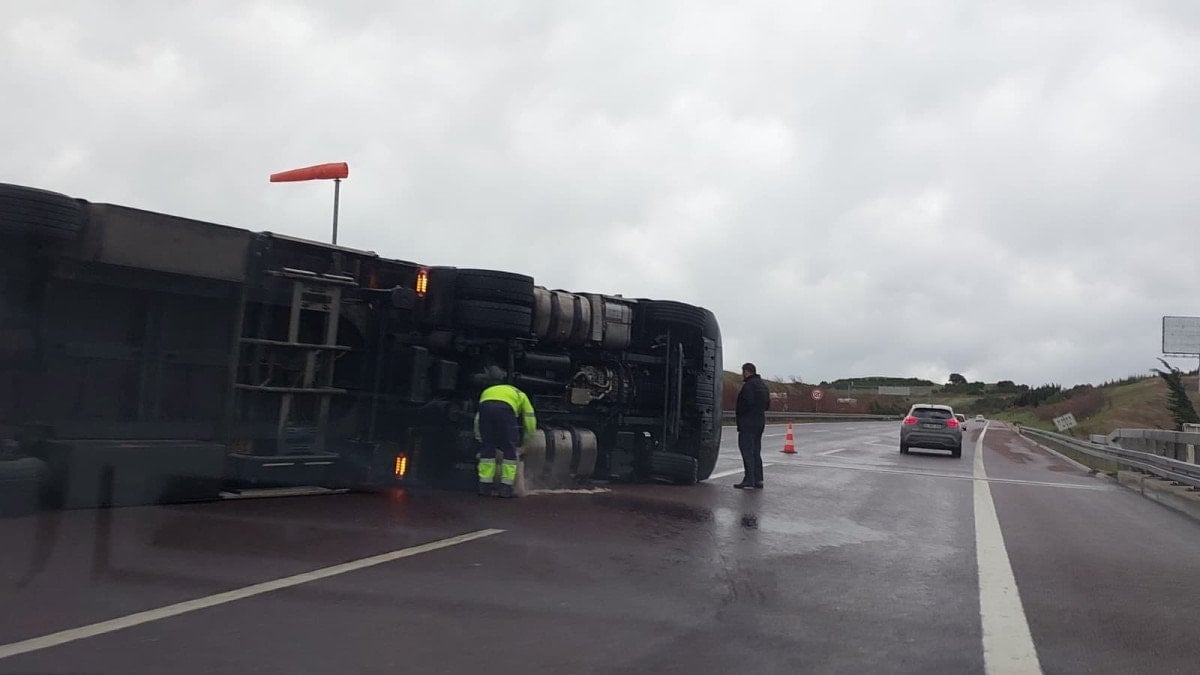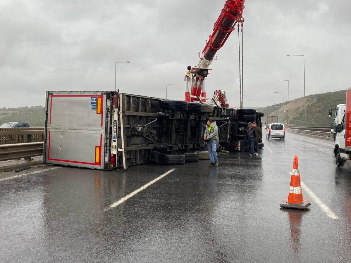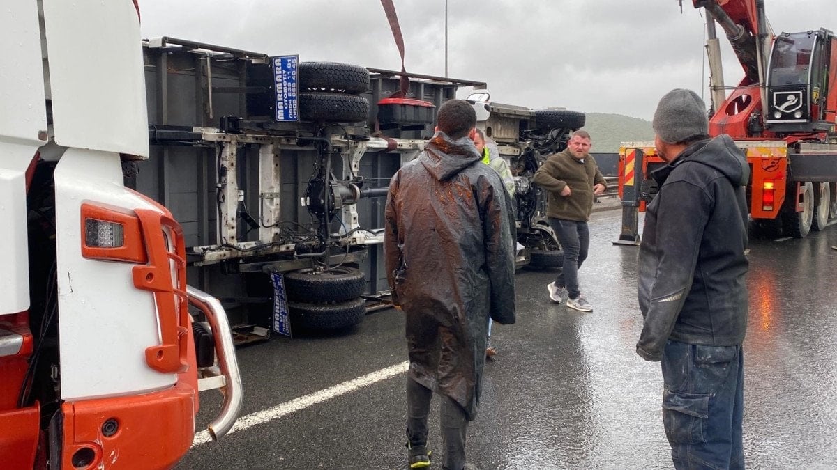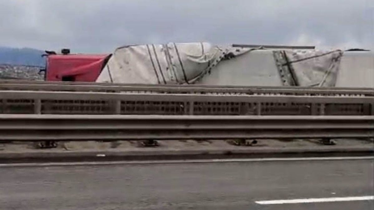 Otoyolun Dilovası ilçesi geçişinde seyir halinde olan 2 tır, şiddetli rüzgarın etkisiyle kontrolden çıkarak devrildi.