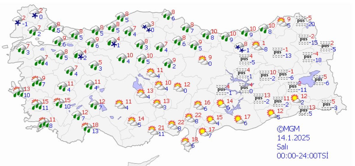 Yurt genelinde mevsim normalleri üzerinde seyretmekte olan hava sıcaklıklarının, Marmara ve Kuzey Ege'de 2 ila 4 derece azalacağı, diğer yerlerde önemli bir değişiklik olmaması tahmin ediliyor.