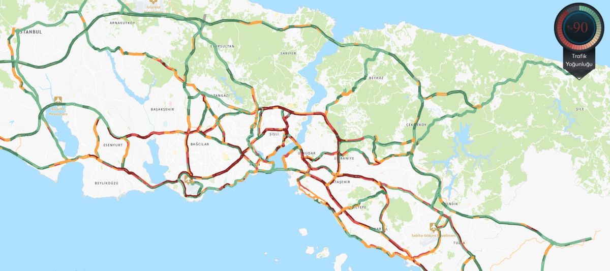 İstanbul Büyükşehir Belediyesi’nin trafik yoğunluğu haritasına göre, akşam saatlerinde kent genelindeki trafik yoğunluğu hem Anadolu hem de Avrupa Yakası’nda yüzde 90 seviyesine çıktı.