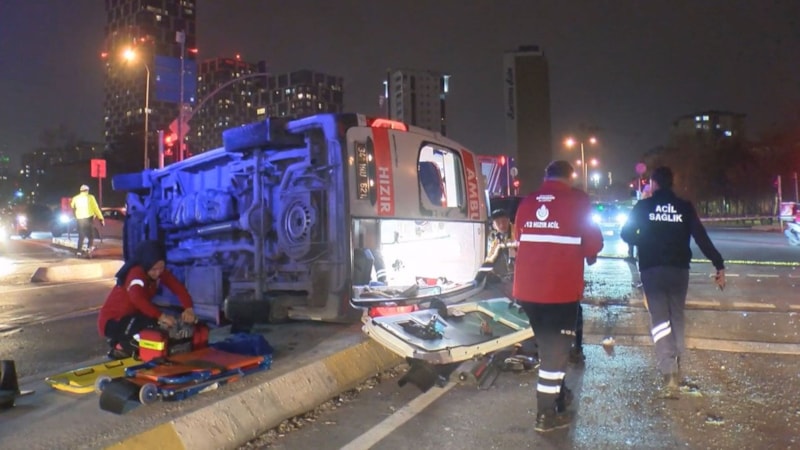 Çarpışmanın şiddetiyle savrulan ambulans devrildi. Kazada ambulansta bulunan hasta ve 2 sağlık personeli yaralandı.