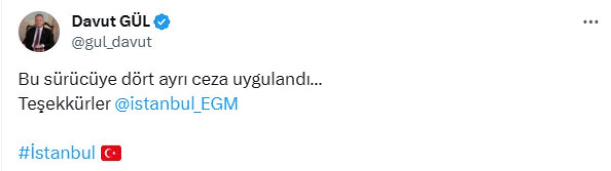 Gül, sürücüye ceza uygulandığını belirterek, İstanbul Emniyet Müdürlüğüne teşekkür etti.