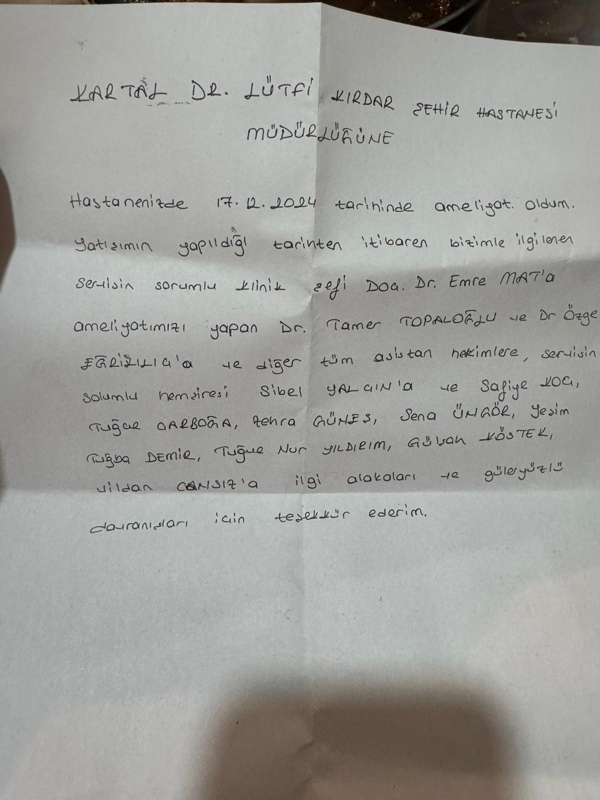 İstanbul'da bulunan Kartal Dr. Lütfi Kırdar Şehir Hastanesi'nde ameliyat olan bir hastanın yazdığı mektup, sosyal medyada çokça paylaşıldı..