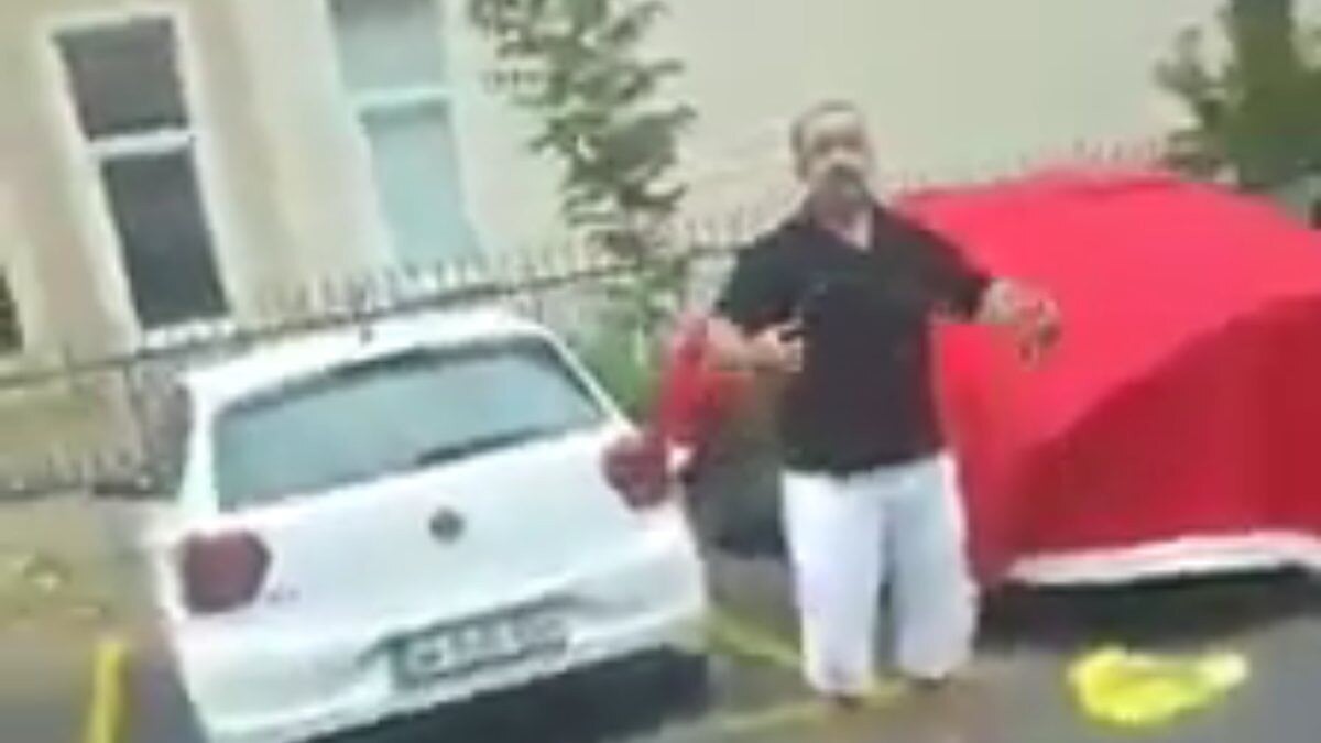 Branda olarak kullanmaya çalıştığı Türk bayrağını kaldırana kadar oradan gitmeyeceğini söyleyen vatandaş, "Türk bayrağını bu şekilde kullanamazsın. Ben izin vermiyorum kardeşim. Türk bayrağını arabanın üstüne örtemezsin." diye tepki gösterdi.