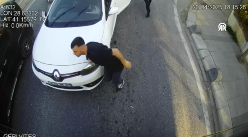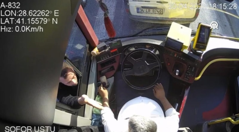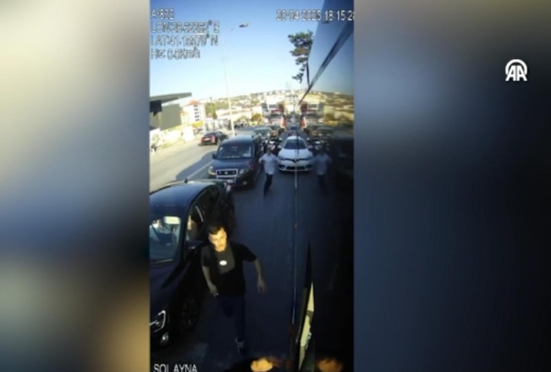 Görüntülerde, trafikte duran otobüsün arkasındaki otomobilden inen 2 kişinin araca doğru koşması, sürücüyle tartışması, ardından zanlılardan birinin otobüsün camına vurup kırması yer alıyor.
