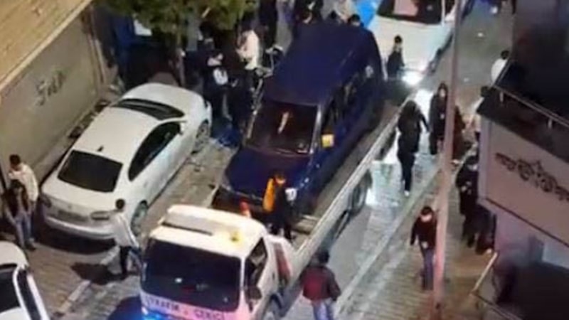 Esenyurt'ta bir grup, ses sistemli araç yükledikleri çakarlı çekiciyle sokak ortasında durarak trafiği felç etti. Kısa sürede yakalanan 4 sürücüye toplamda 195 bin 864 lira para cezası uygulanırken sürücülerin trafiği durdurdukları ve yüksek sesle etrafı rahatsız ettikleri anlar cep telefonu kamerasına yansıdı.
