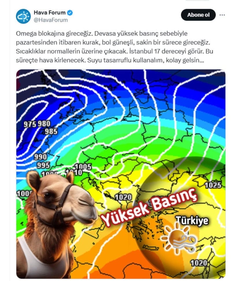 Hava Forum'un paylaşımına göre; Devasa yüksek basınç sebebiyle pazartesinden itibaren kurak, bol güneşli, sakin bir hafta geçecek.