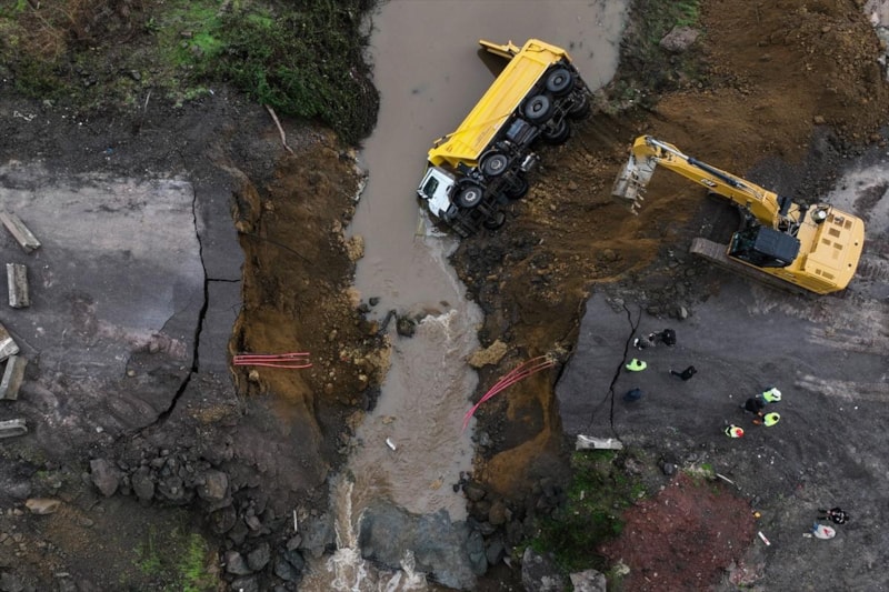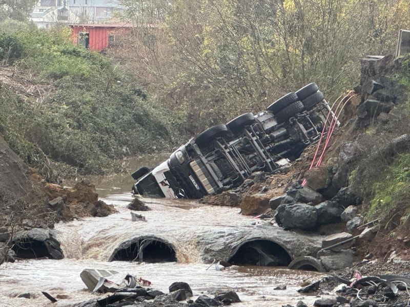 Çöken yola park halindeki bir kamyon düşerken, taşkın suları bölgedeki bir restorana doldu.