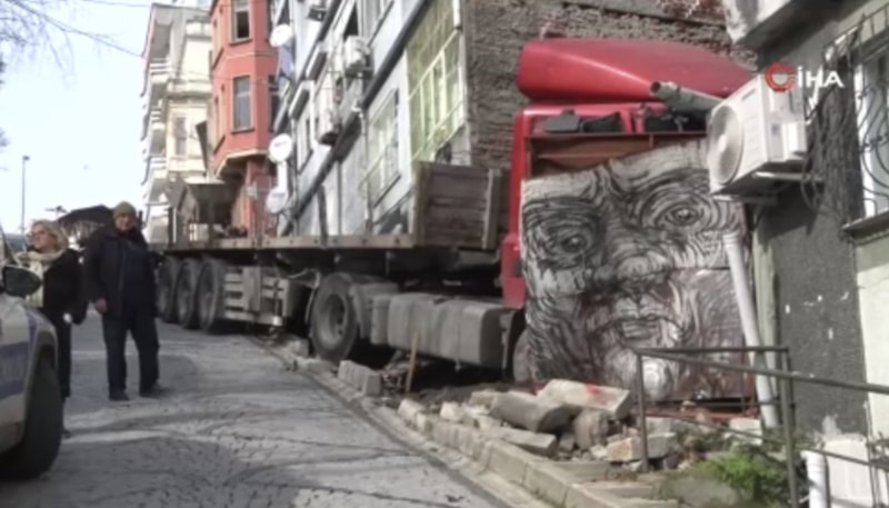 O sırada park halinde bulunan tır, freni boşalınca yokuş aşağı kaymaya başladı ve ardından sokakta bulunan 5 katlı bir binanın yan duvarına çarparak durabildi.