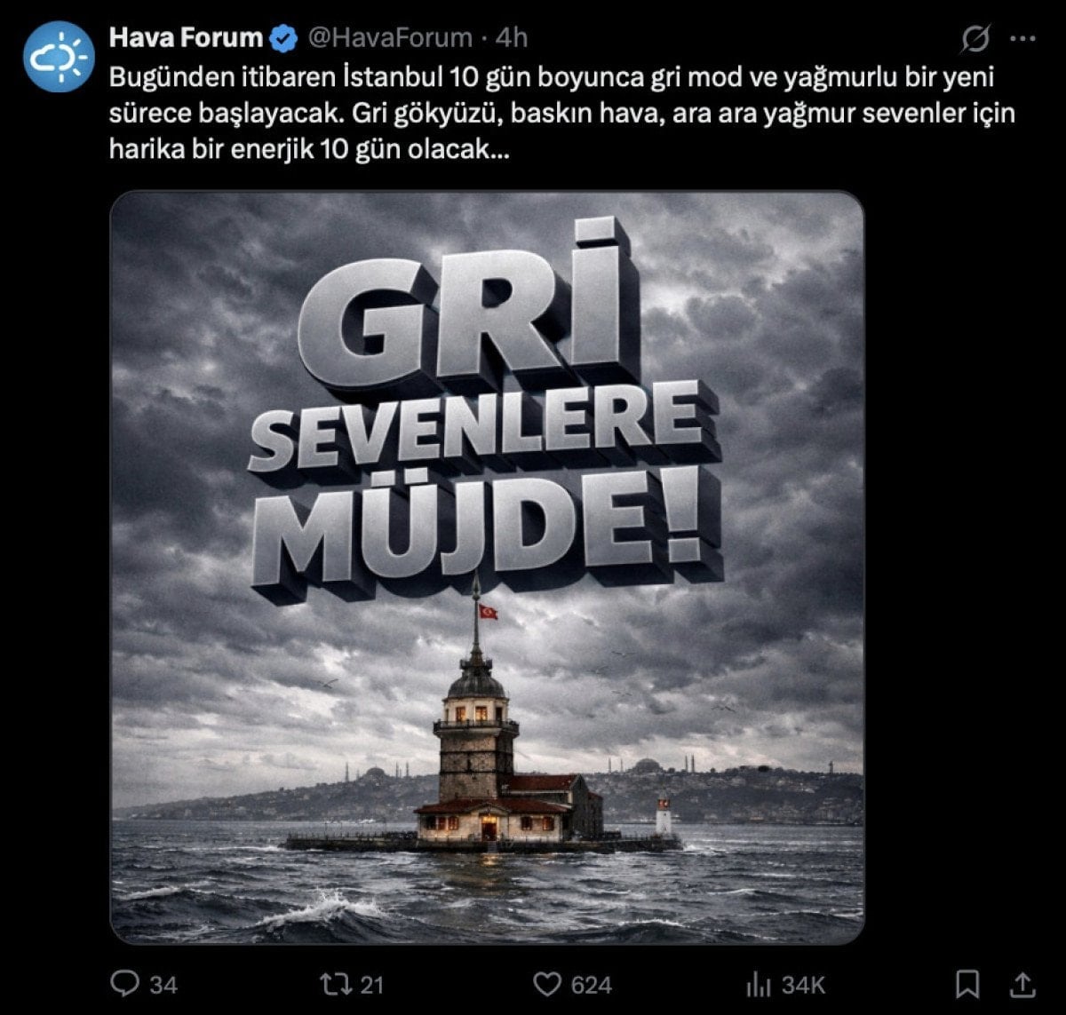 “Bugünden itibaren İstanbul 10 gün boyunca gri mod ve yağmurlu bir yeni sürece başlayacak. Gri gökyüzü, baskın hava, ara ara yağmur sevenler için harika bir enerjik 10 gün olacak…”